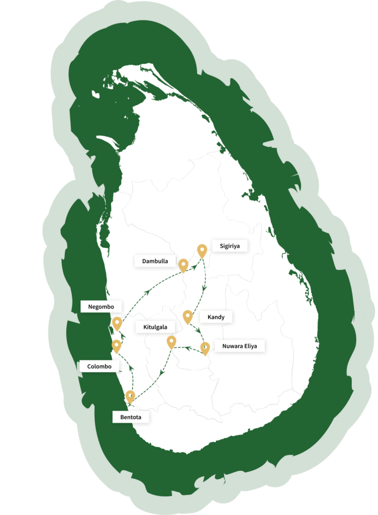 Start your journey in Sri Lanka with a relaxing stay by the beach after your arrival at Bandaranaike International Airport. Travel to Sigiriya and explore the awe-inspiring Sigiriya Rock Fortress along with the ancient Dambulla Cave Temple. Enjoy an exciting jeep safari in Minneriya National Park where you can spot wild elephants roaming freely. The trip also includes visits to Kandy’s spice gardens and the revered Temple of the Sacred Tooth Relic, finishing with scenic drives through the tea-covered hills and peaceful beach time in Bentota.
